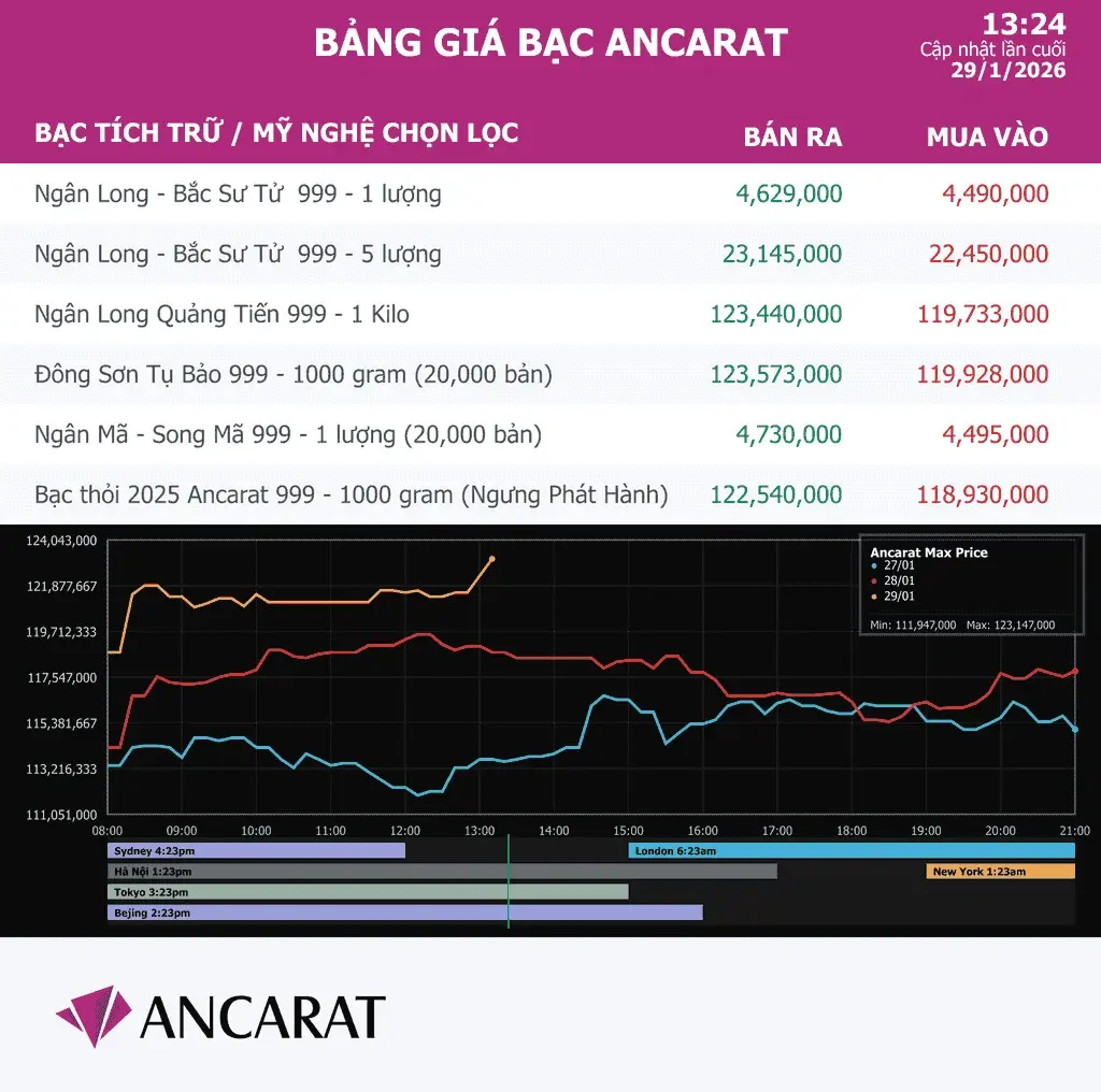 Thời hoàng kim ngắn ngủi: Bảng giá trưa (29/1) ghi nhận mức đỉnh lịch sử khi 1kg bạc bán ra vượt 123 triệu đồng và 1 lượng Ngân Long chạm ngưỡng 4,6 triệu đồng.