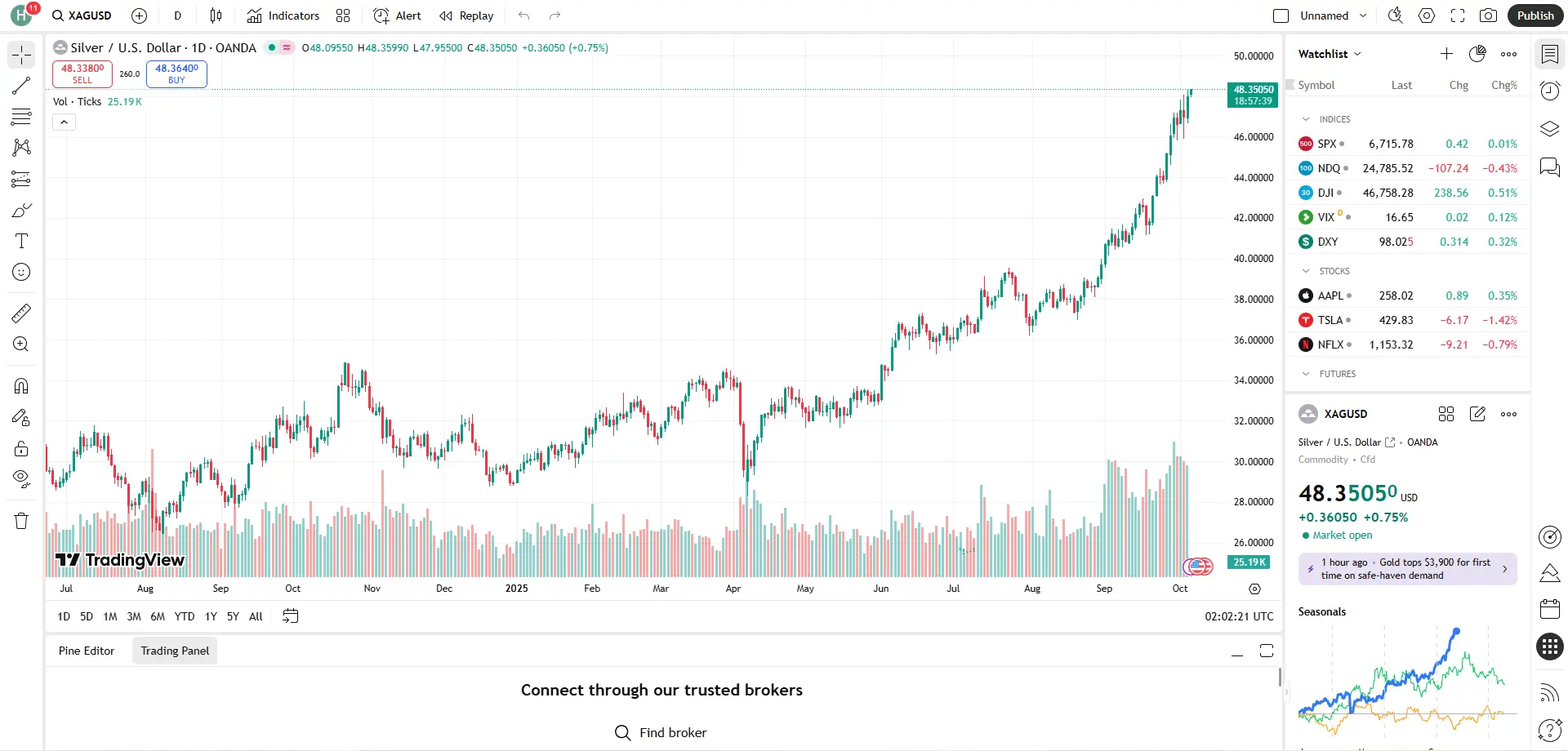 Giá bạc hôm nay 6/10, mở đầu tuần giao dịch mới với một phiên tăng giá bùng nổ, tiếp nối đà đi lên đầy mạnh mẽ từ tuần trước. Động lực chính cho đợt tăng giá này đến từ "cơn sốt" tìm kiếm kênh trú ẩn an toàn trên toàn cầu, một làn sóng đã đẩy giá vàng lần đầu tiên trong lịch sử vượt mốc 3,900 USD.