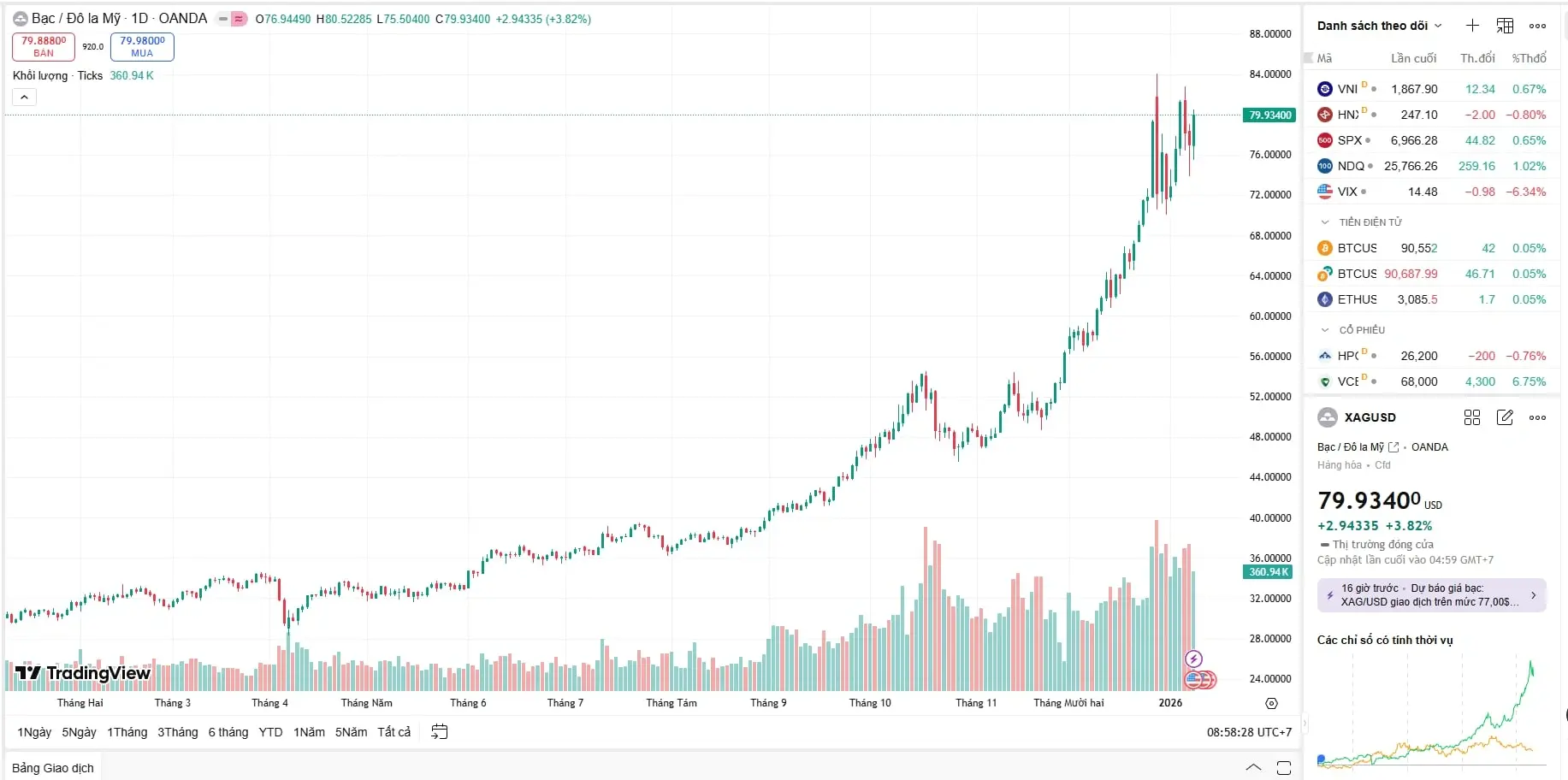 Mở cửa phiên giao dịch, giá bạc thế giới (XAG/USD) đã có cú bứt phá mạnh mẽ, chạm ngưỡng 79.93 USD/ounce.