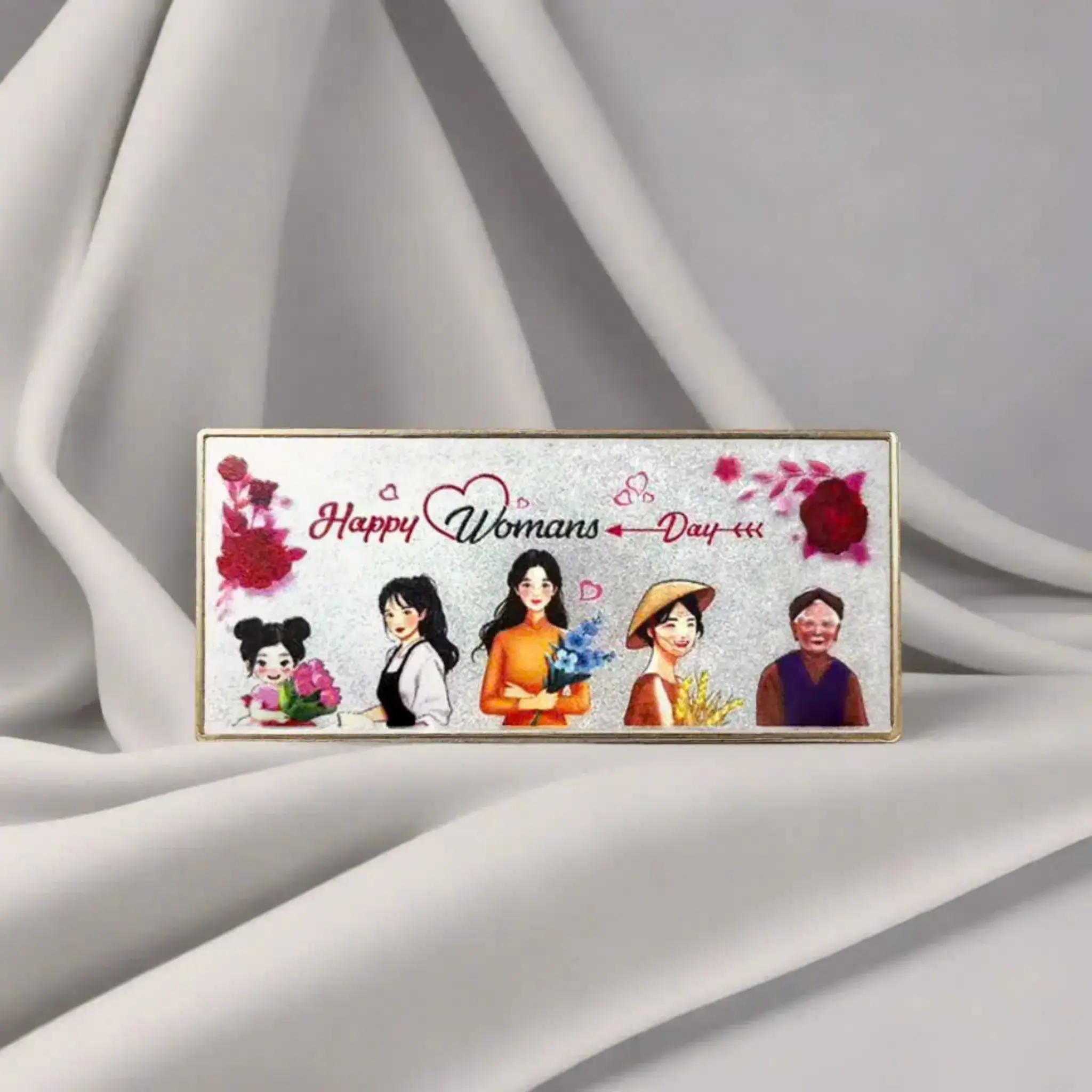 Sản phẩm thứ hai lồng ghép biểu tượng Áo dài truyền thống Việt Nam – "linh hồn" của vẻ đẹp phụ nữ Việt. Hình ảnh người phụ nữ mặc áo dài đỏ thắm, tay ôm bó hoa rực rỡ được in màu sắc nét trên nền bạc gương sáng loáng.