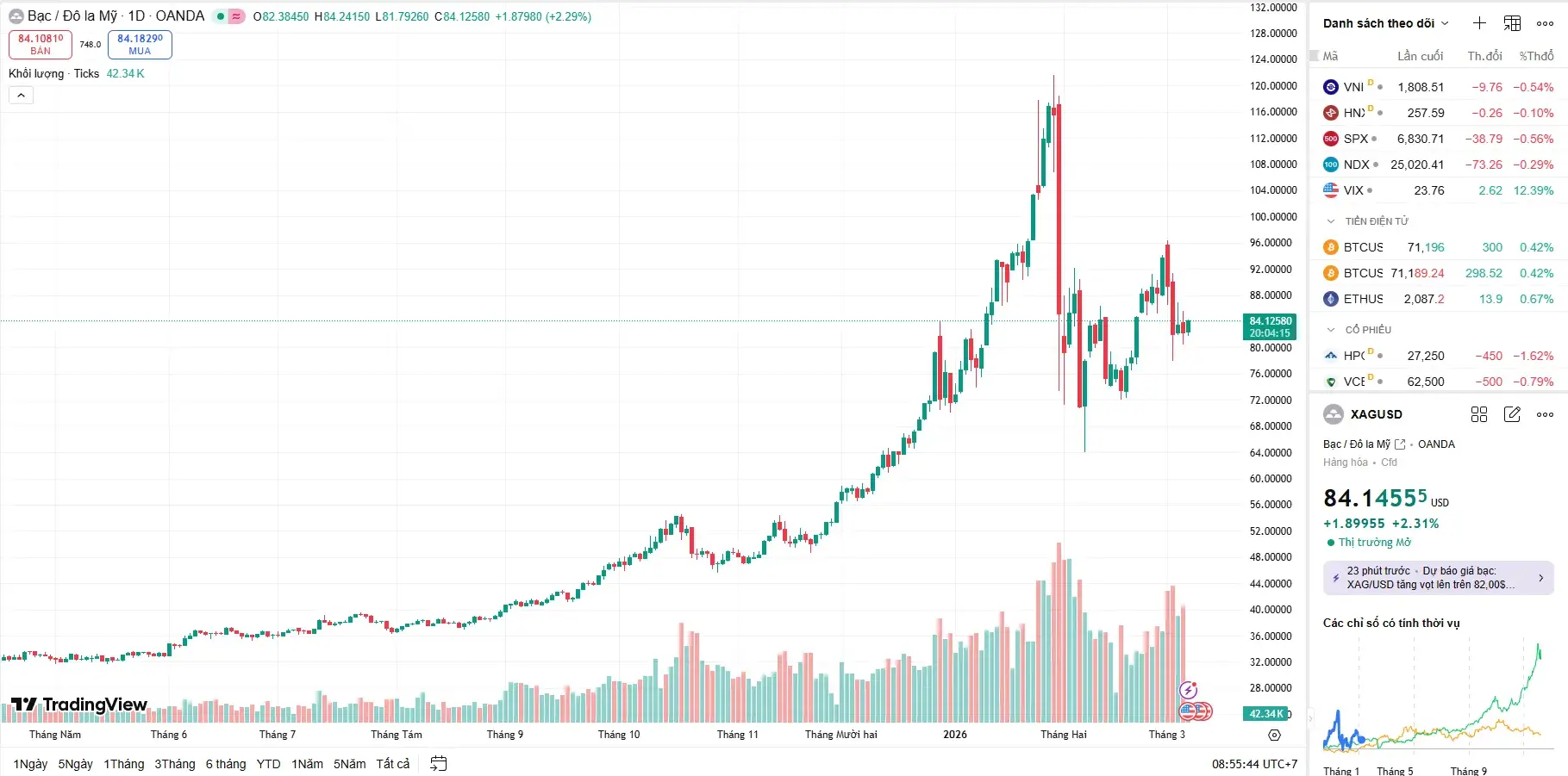 So với mức 84.82 USD của ngày hôm qua (05/03), giá bạc thế giới đã ghi nhận mức giảm nhẹ khoảng 0.75%.