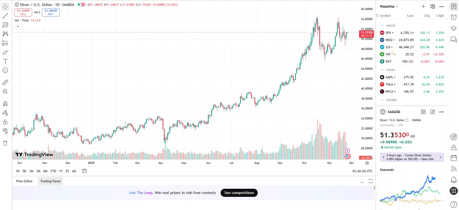 - Giá bạc bây giờ trên thị trường quốc tế (~$51.35/ounce) đã đẩy giá trong nước vượt lên trên mốc tâm lý quan trọng.